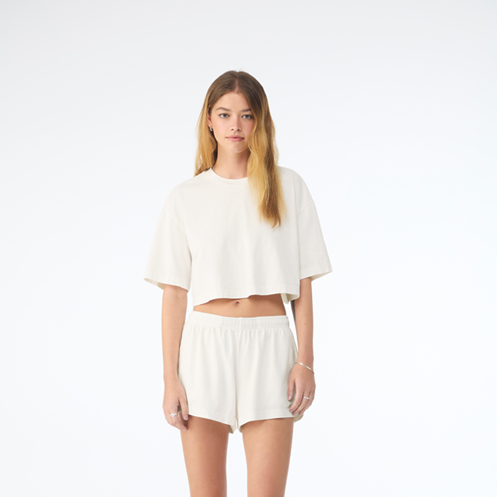 100% Ring-spun cotton, 18 singles, 6.5 oz. With side pockets. Flared fit.Shirred elastic waistband. Braided rounded cord- 100% DTM Polyester.Double needle cover stitch hem. Tear away label.