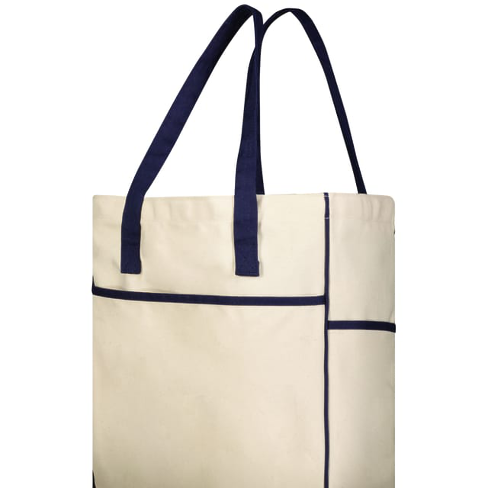 100% cotton. Deep front pocket. Dual side pockets.Interior valuables zippered pocket with key ring.6-inch bottom gusset. Double layer canvas handles.