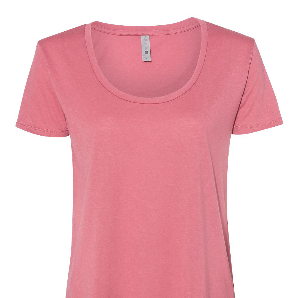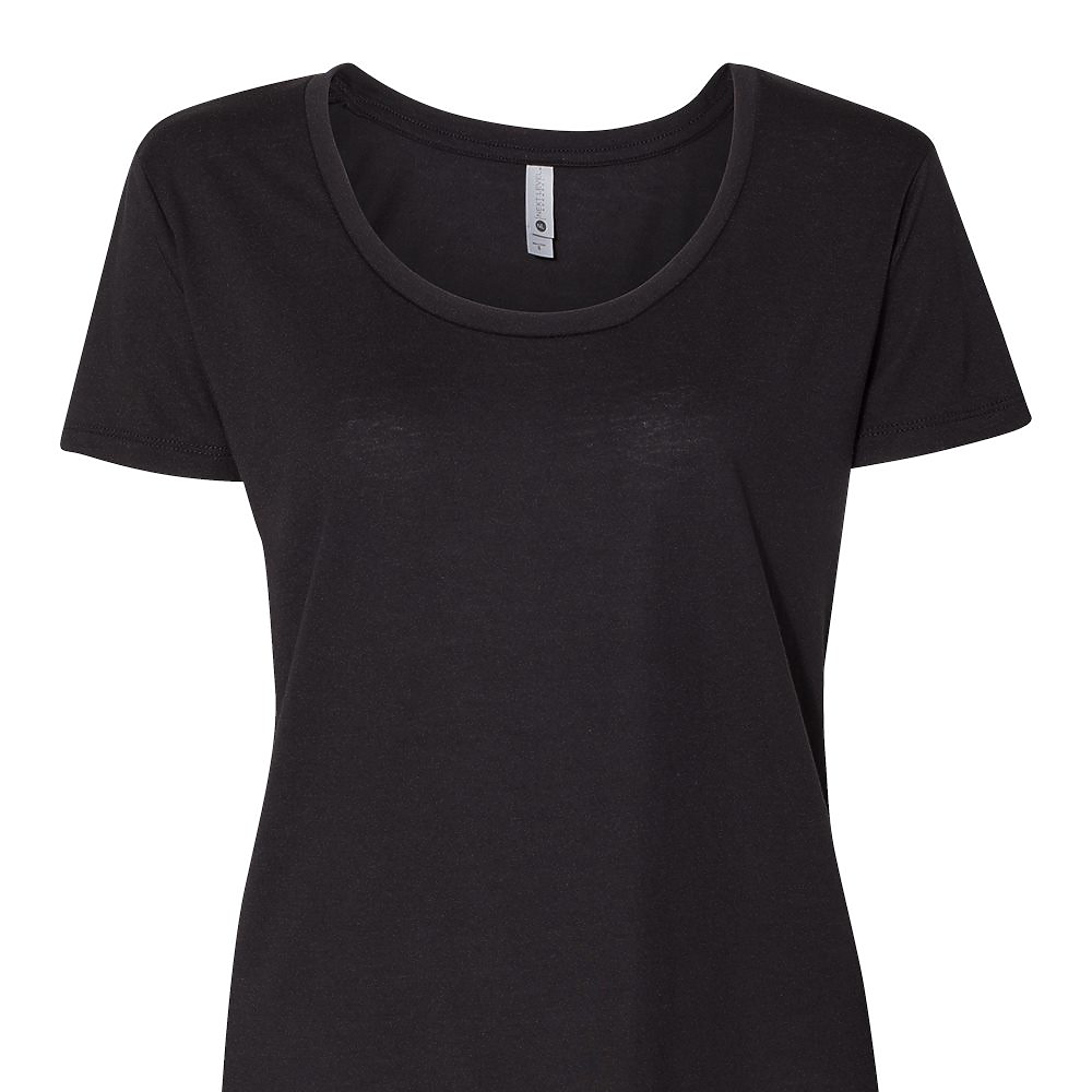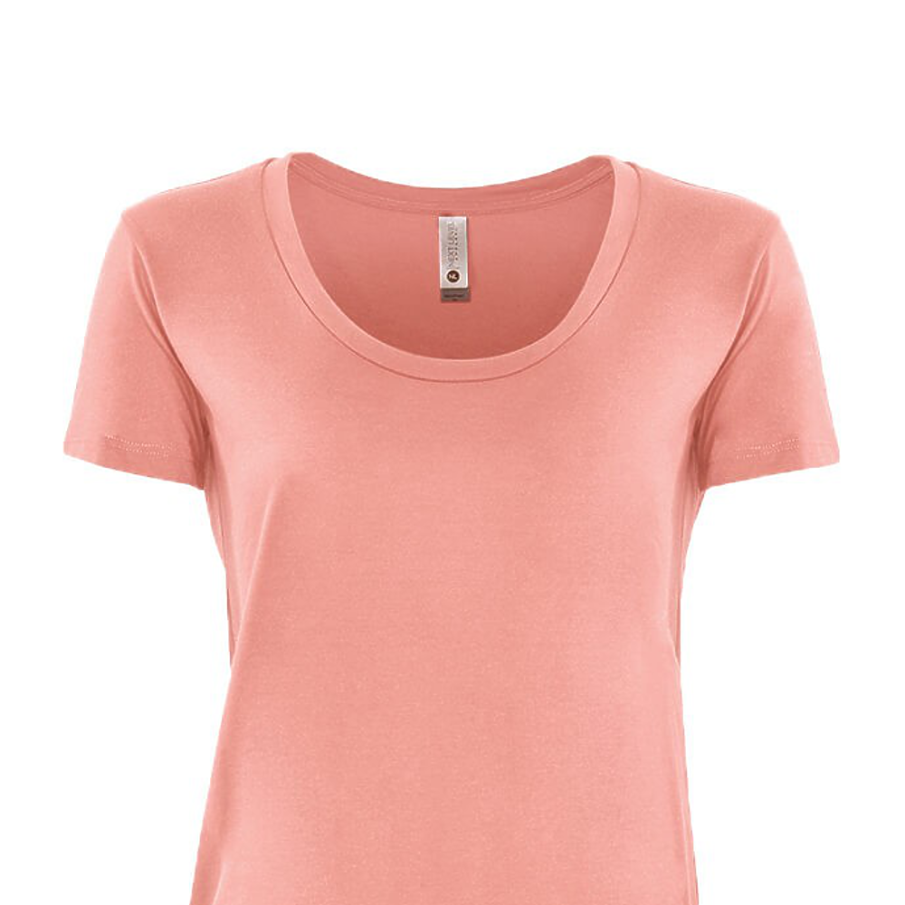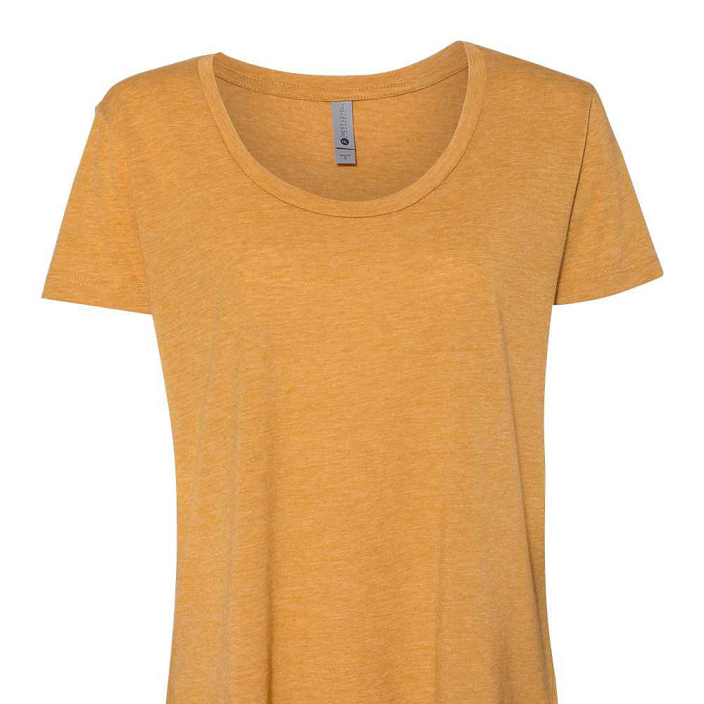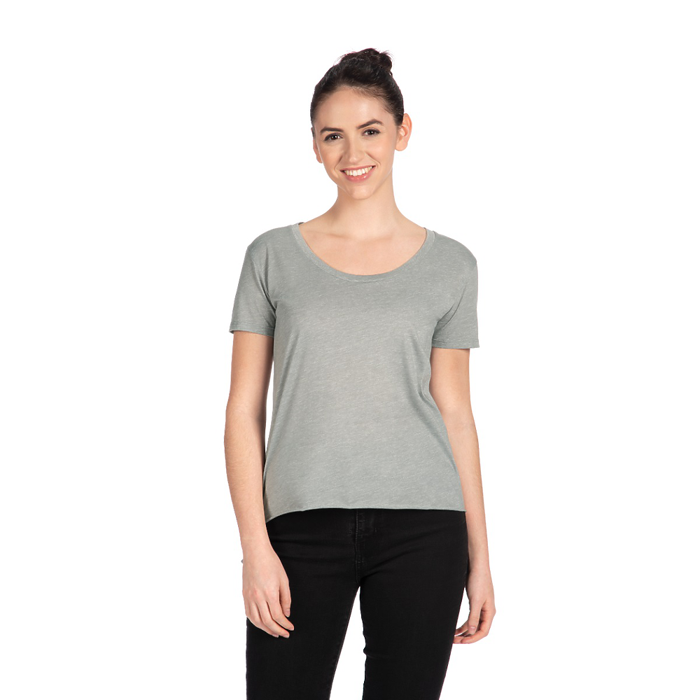 Next Level Women's 3.5 Ounce Festival Scoop Neck T-Shirt. 65/35% poly/combed ring-spun cotton 40 singles, 3.5 ounces. 1x1 baby rib scoop neckline. Relaxed fit. Hemmed sleeve, side seamed. 3/8 shoulder to shoulder binding. Raw edge, exaggerated droptail hem. Tear away label.