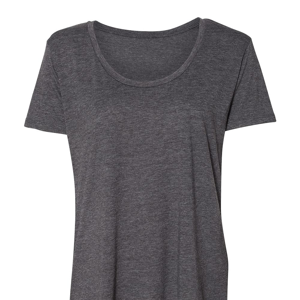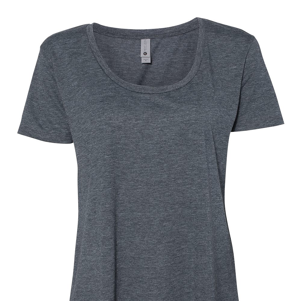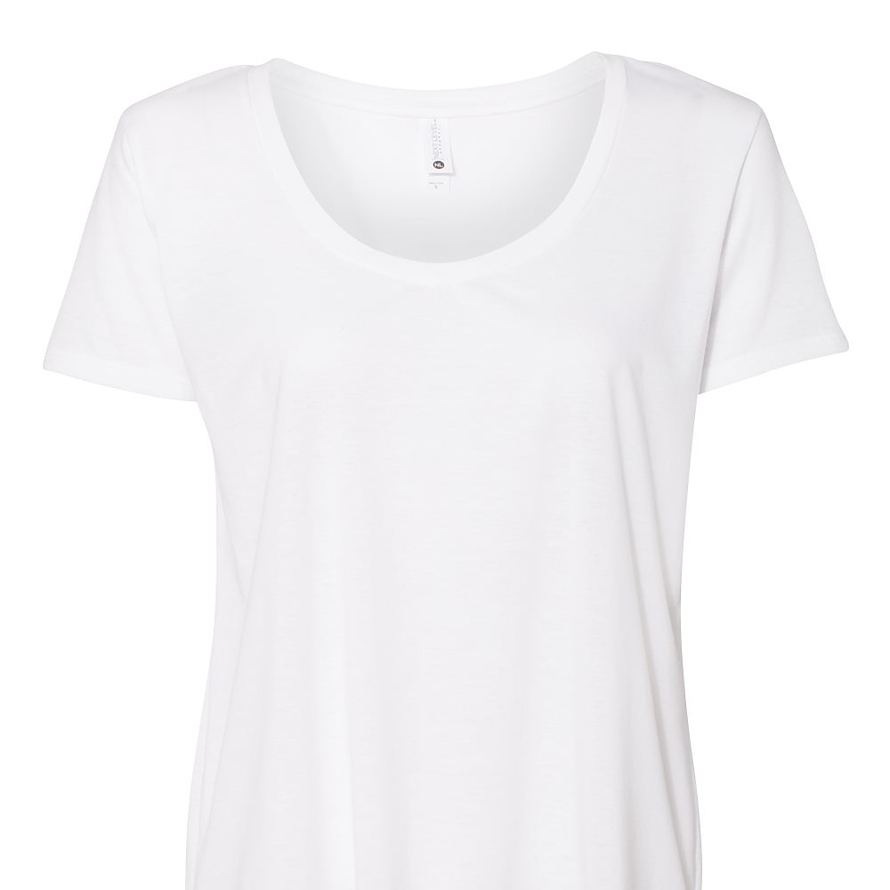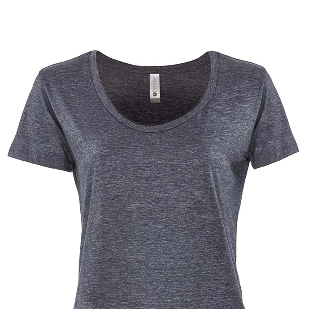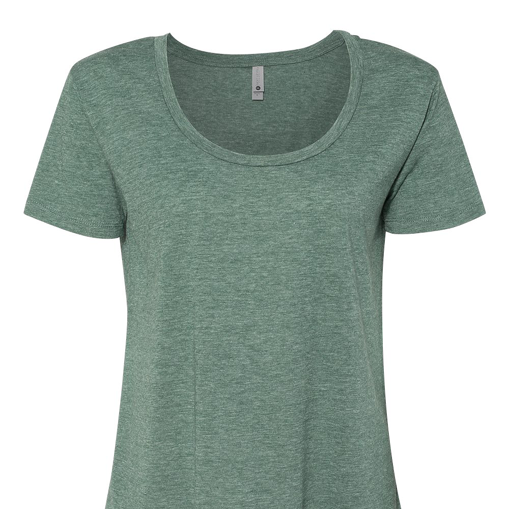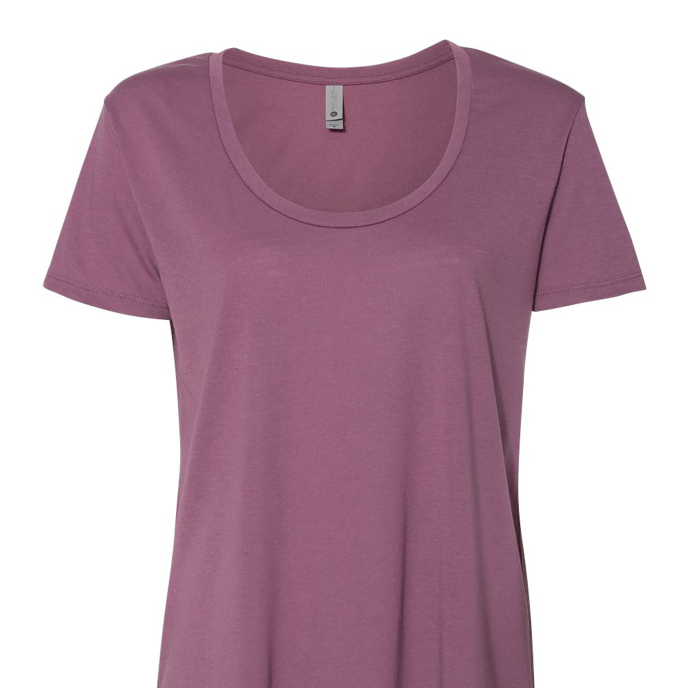 Next Level Women's 3.5 Ounce Festival Scoop Neck T-Shirt. 65/35% poly/combed ring-spun cotton 40 singles, 3.5 ounces. 1x1 baby rib scoop neckline. Relaxed fit. Hemmed sleeve, side seamed. 3/8 shoulder to shoulder binding. Raw edge, exaggerated droptail hem. Tear away label.