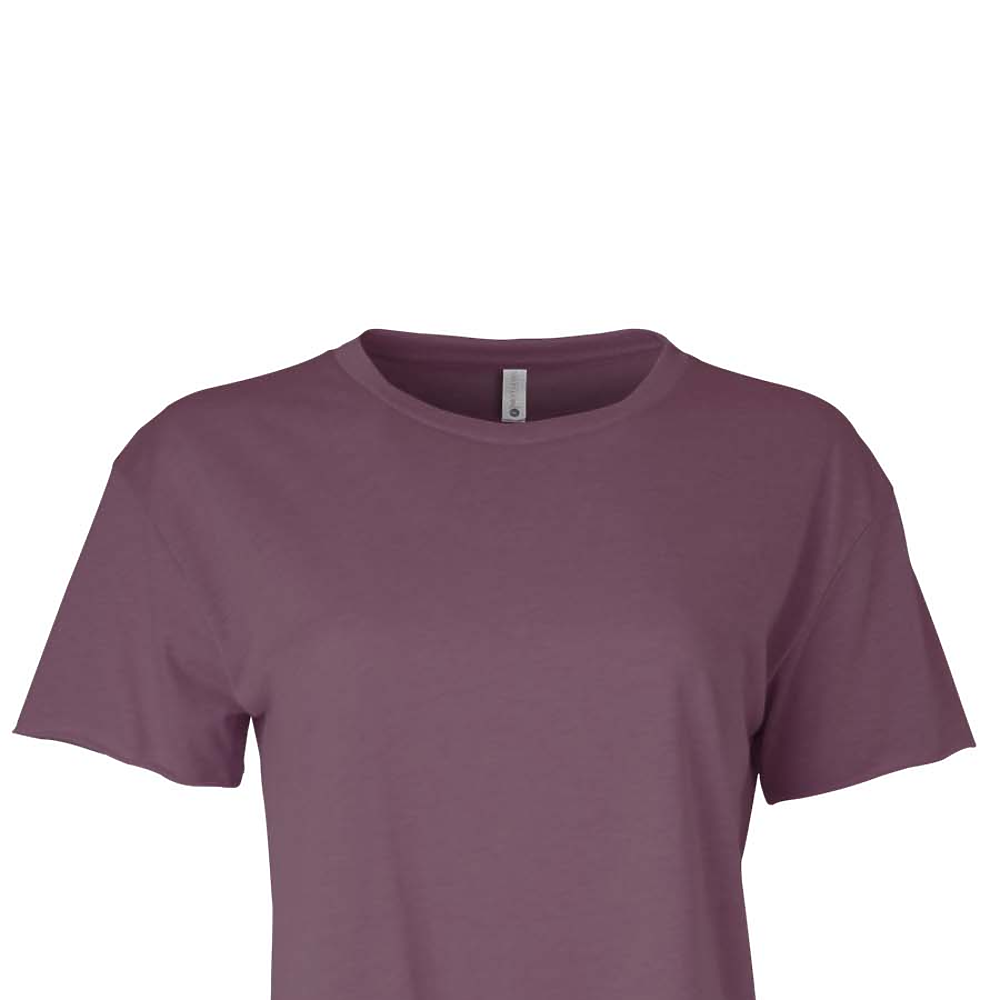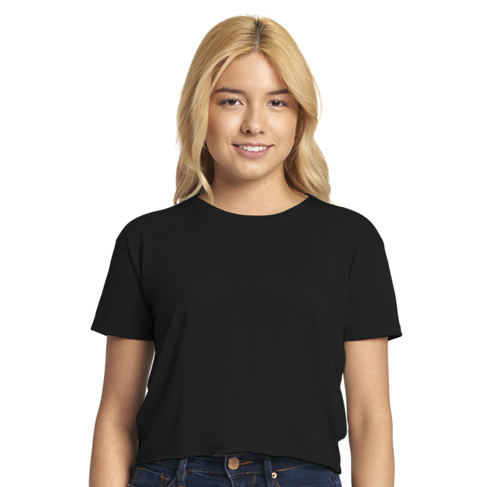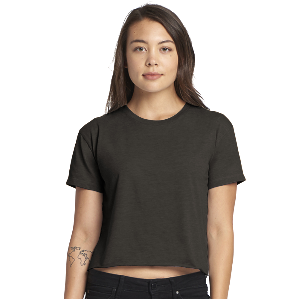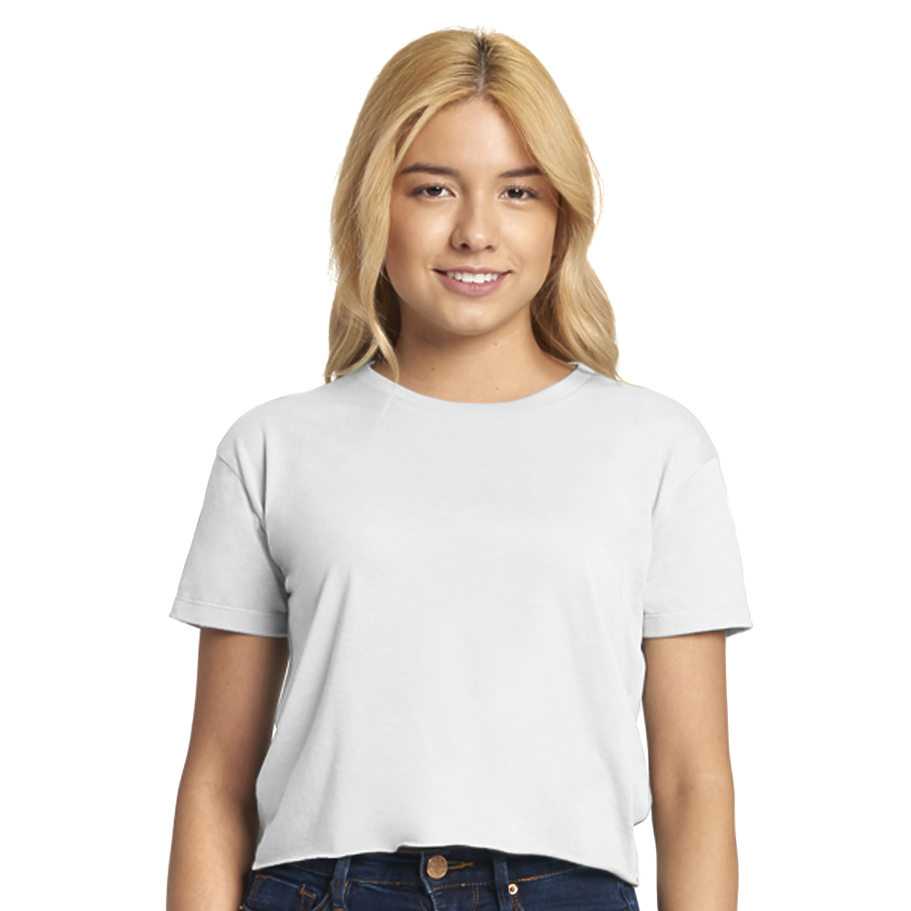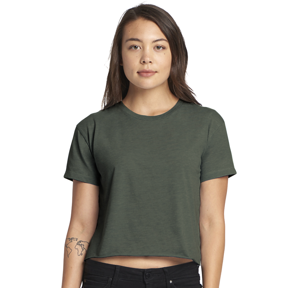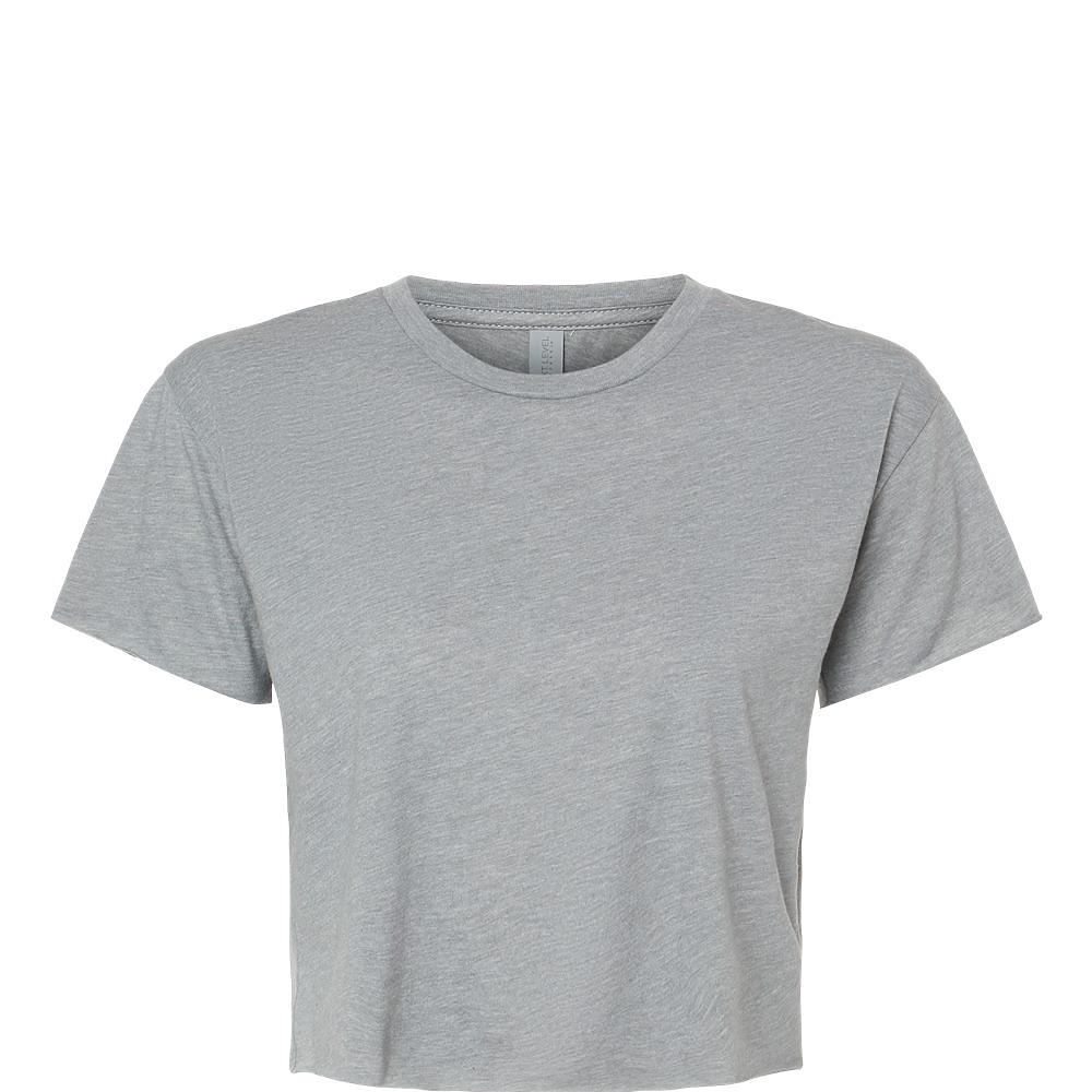 Next Level Women's 3.5 Ounce Festival Crop Top. 65/35% poly/combed ring-spun cotton. Raw edge hem and sleeves. Cropped body with a relaxed fit. Side seamed. 3/8 shoulder to shoulder binding. ?3.5 ounce fabric. Tear away label.