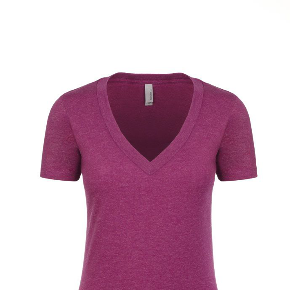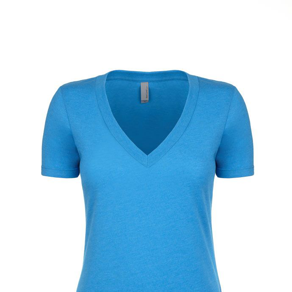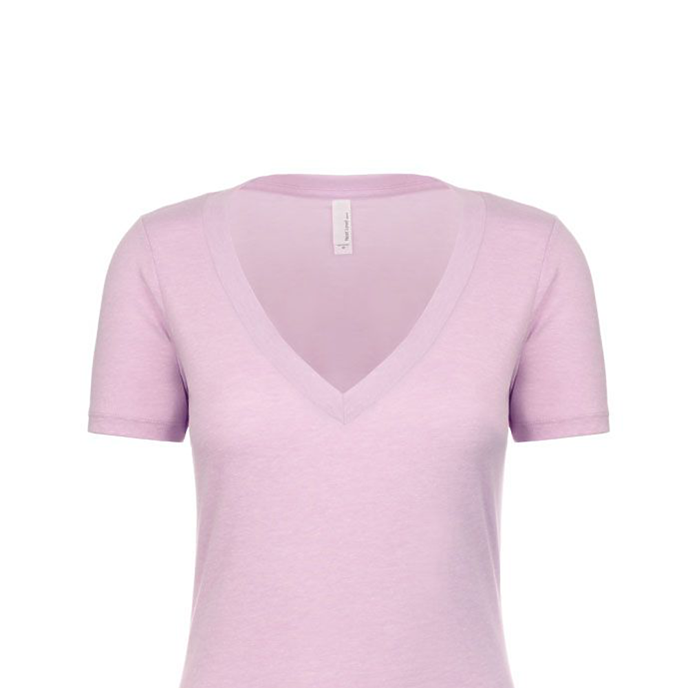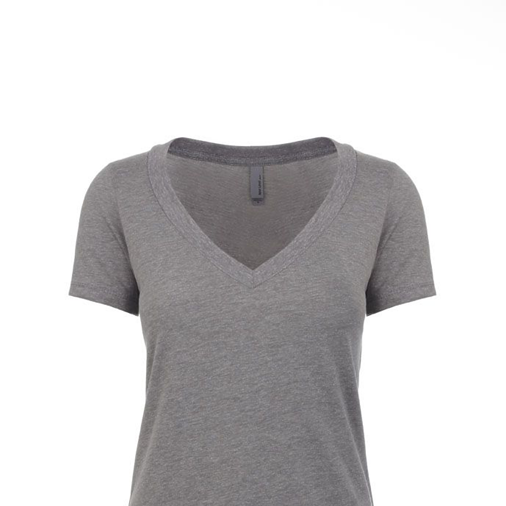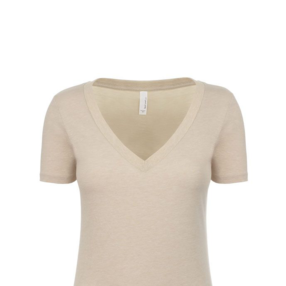 Next Level Ladies 4.3 Ounce CVC Deep V-Neck T-Shirt. 60/40% combed ring-spun cotton/poly jersey short sleeve v-neck tee. 32 singles, 4.3 ounce. 1x1 baby rib set-in collar. Tear away label.