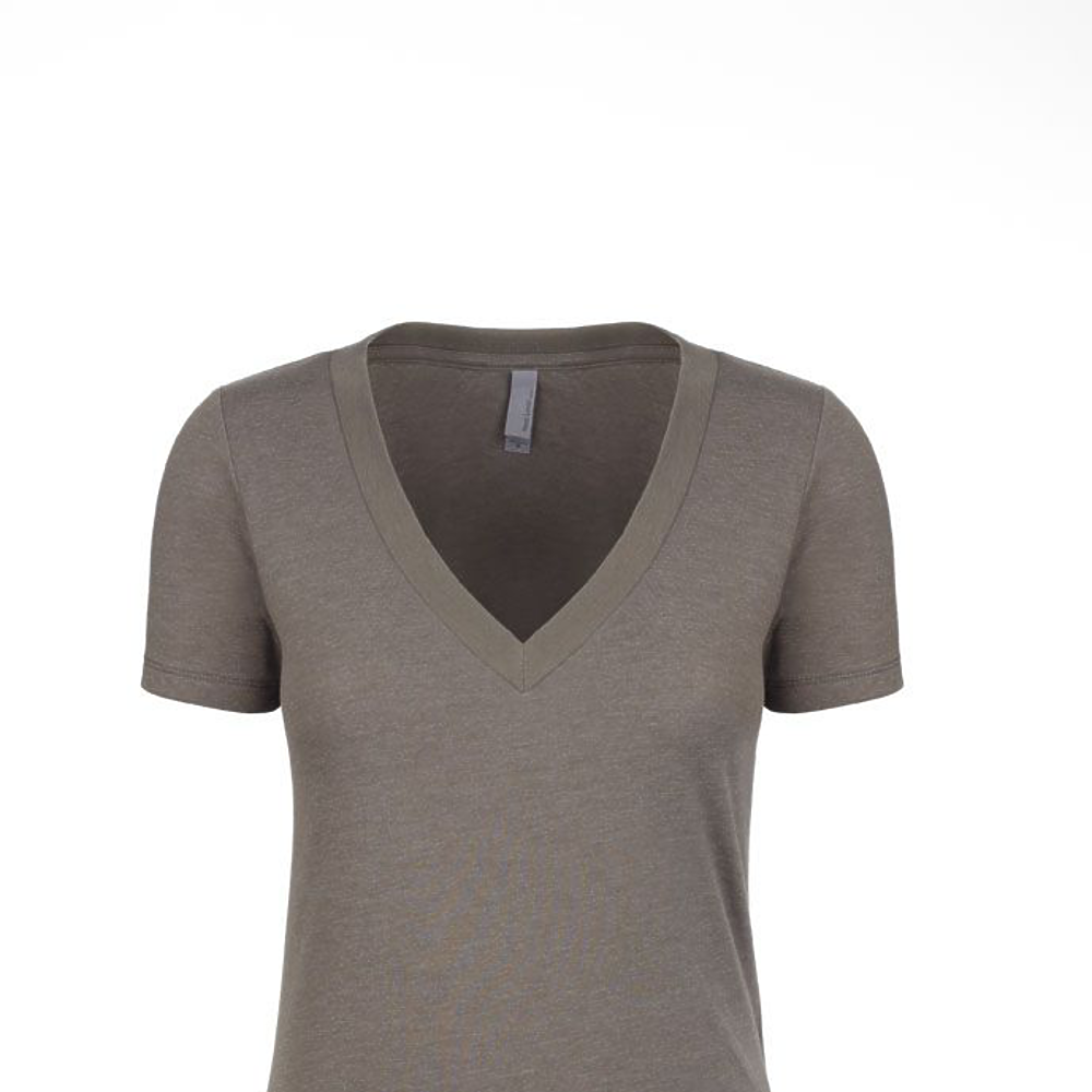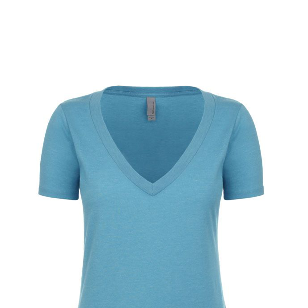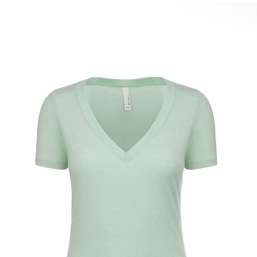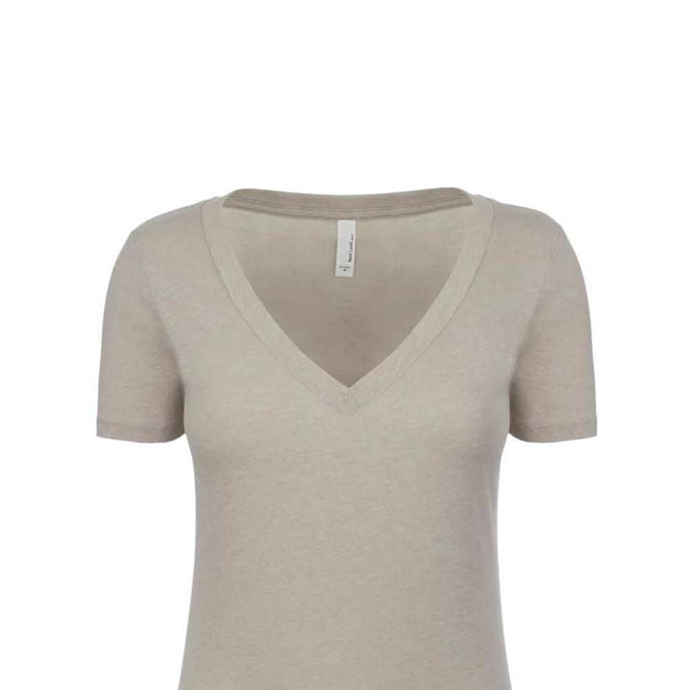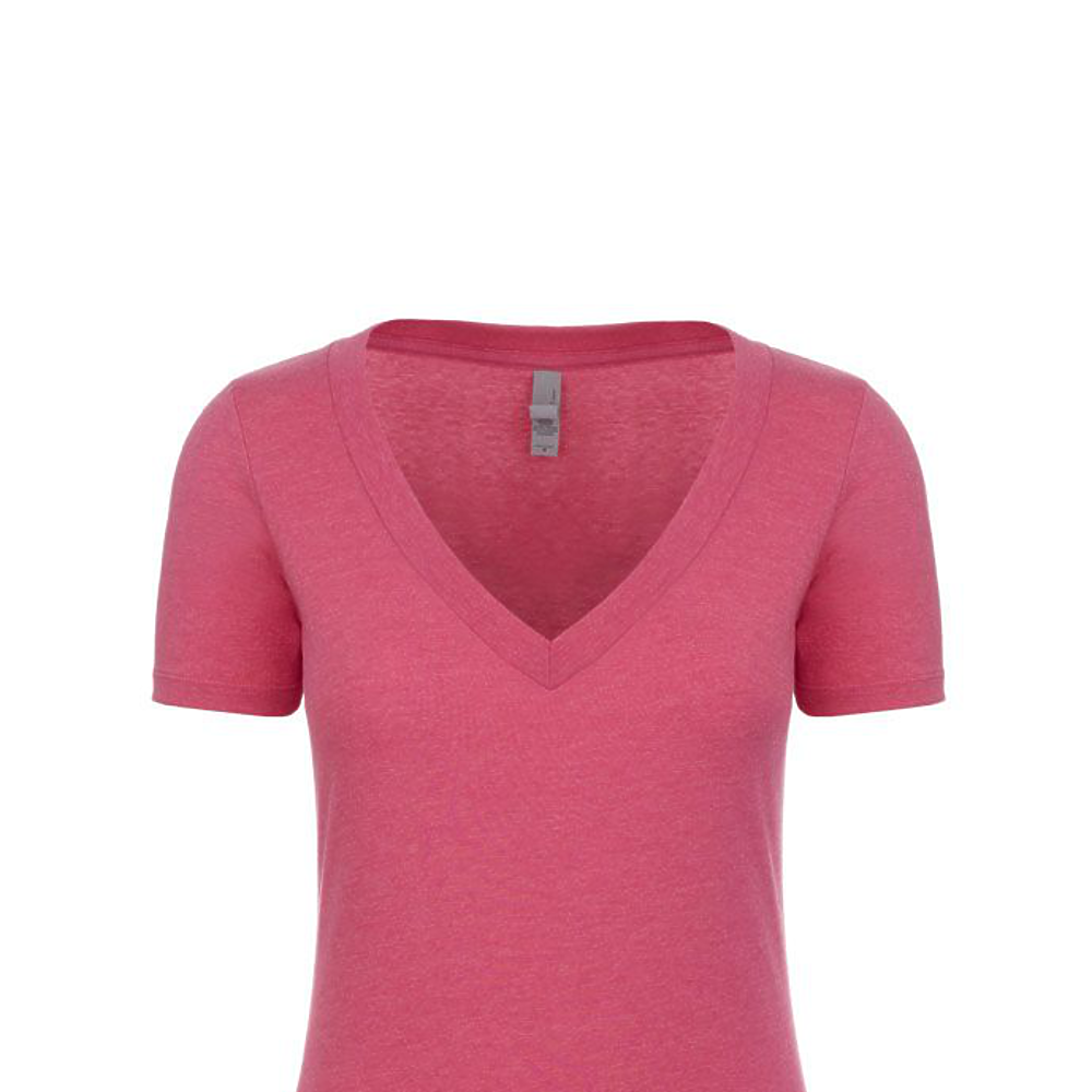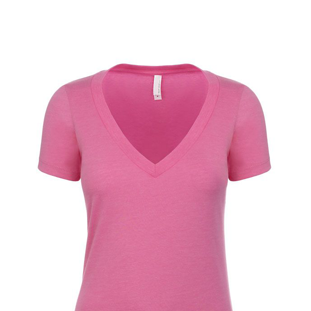 Next Level Ladies 4.3 Ounce CVC Deep V-Neck T-Shirt. 60/40% combed ring-spun cotton/poly jersey short sleeve v-neck tee. 32 singles, 4.3 ounce. 1x1 baby rib set-in collar. Tear away label.