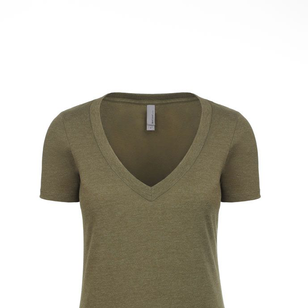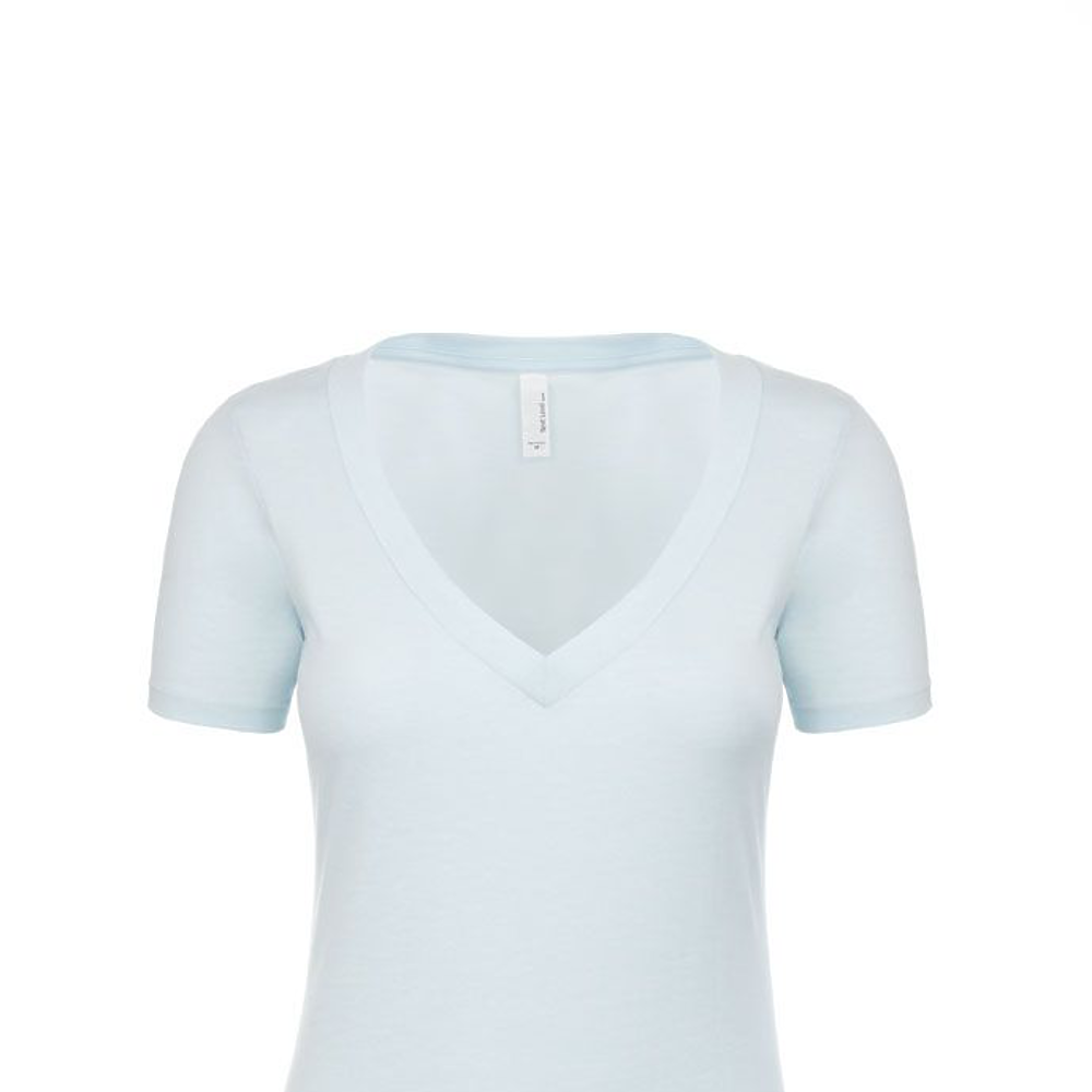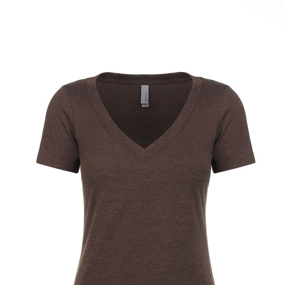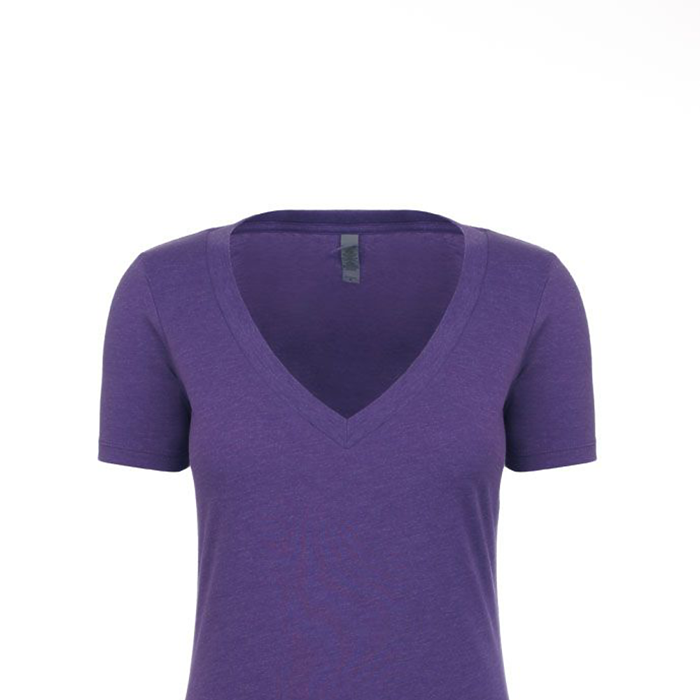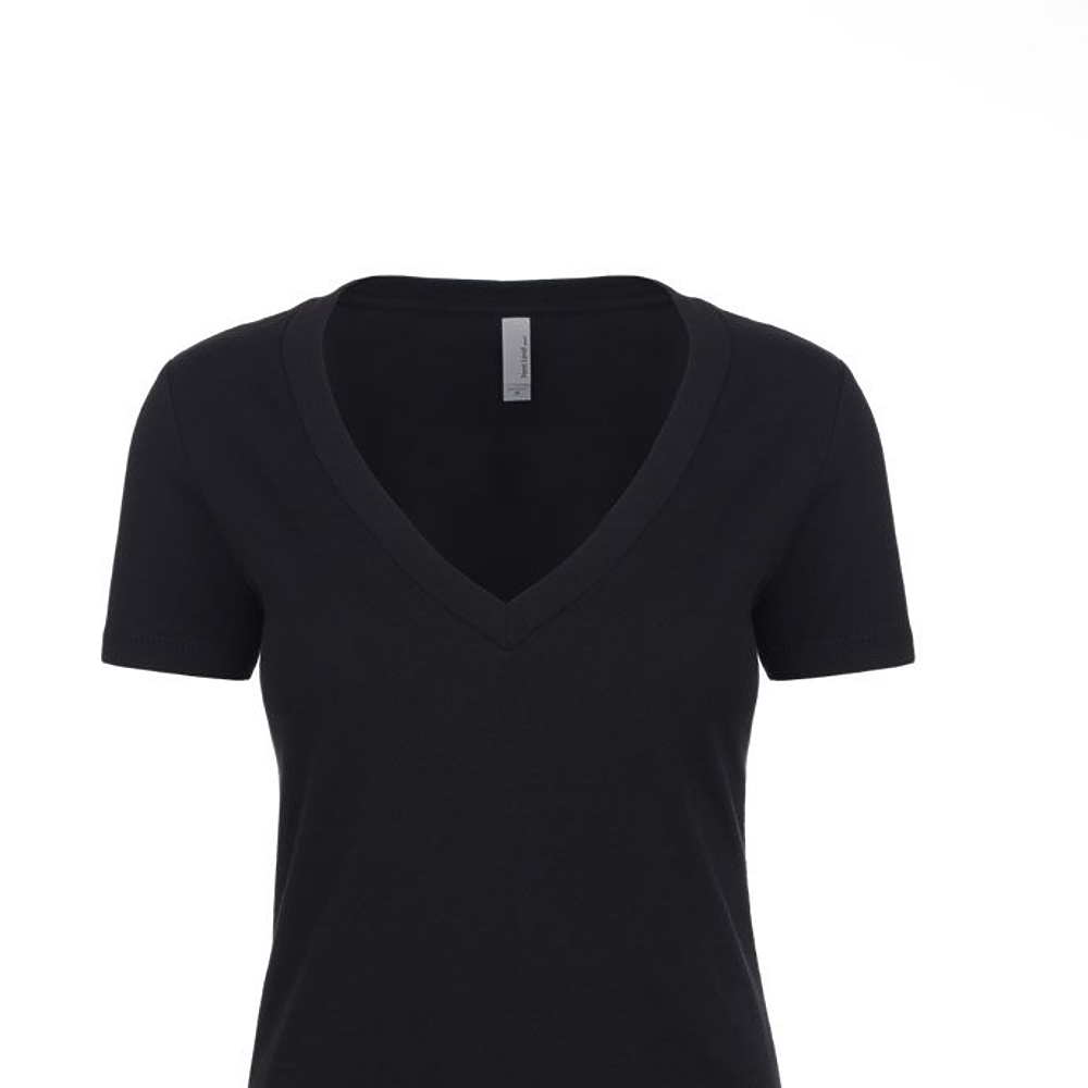 Next Level Ladies 4.3 Ounce CVC Deep V-Neck T-Shirt. 60/40% combed ring-spun cotton/poly jersey short sleeve v-neck tee. 32 singles, 4.3 ounce. 1x1 baby rib set-in collar. Tear away label.