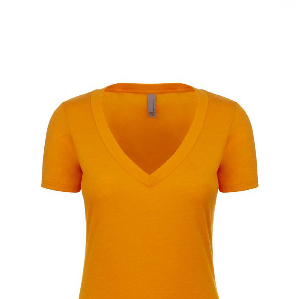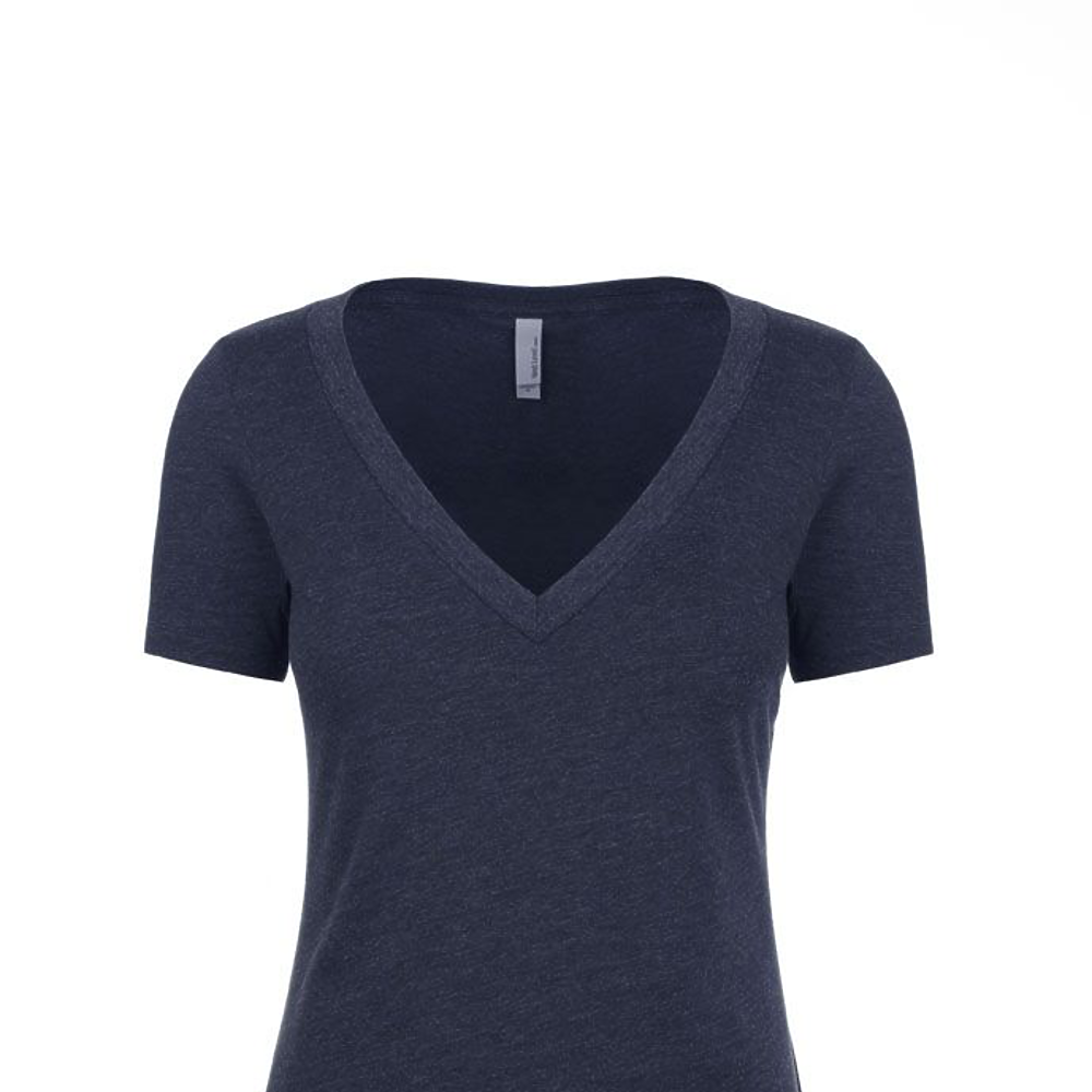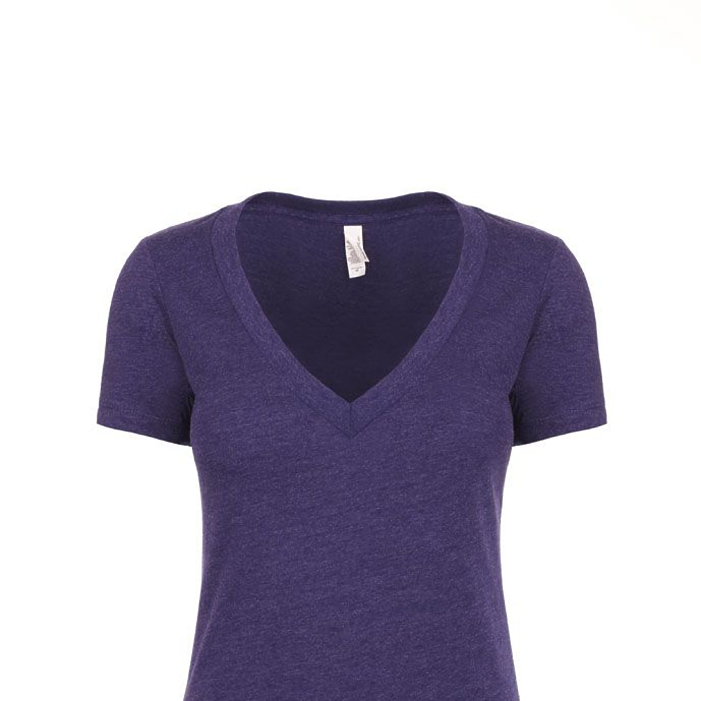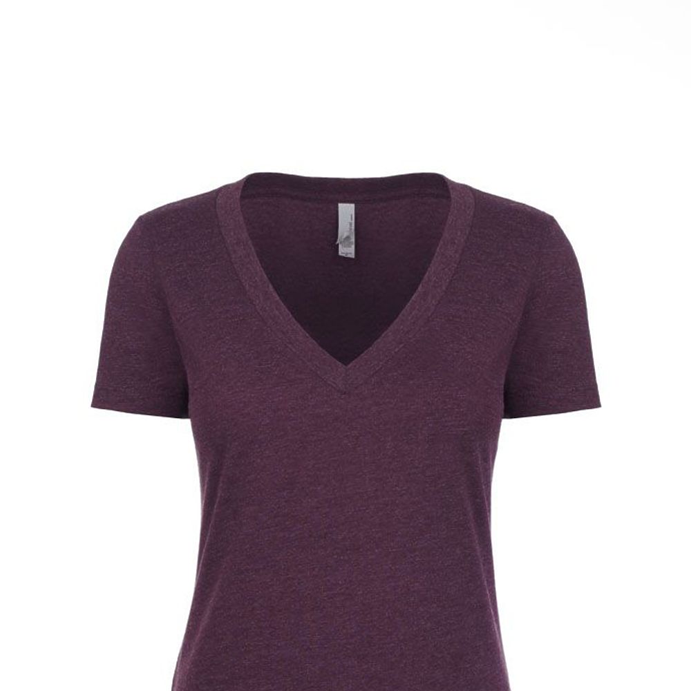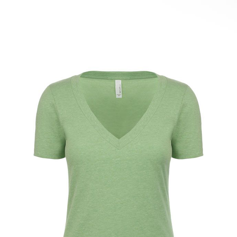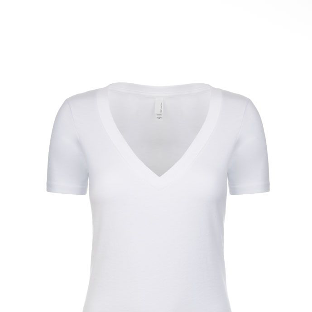 Next Level Ladies 4.3 Ounce CVC Deep V-Neck T-Shirt. 60/40% combed ring-spun cotton/poly jersey short sleeve v-neck tee. 32 singles, 4.3 ounce. 1x1 baby rib set-in collar. Tear away label.